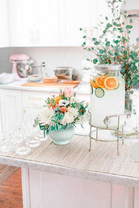 Esta es una de las partes favoritas de la colaboración, experimentar con los colores de las bebidas resulta ser un ejercicio bastante interesante, bebidas con colores pastel podrían ser la mejor opción para dar un toque de tranquilidad y combinar con el resto de la comida. Esto lo podemos obtener preparando aguas de distintos sabores, estas darán un colorido especial a tu mesa además de que resulta la opción más sana de consumir. En caso de que sea temporada invernal también puedes adornar con tés calientes o en todo caso café.